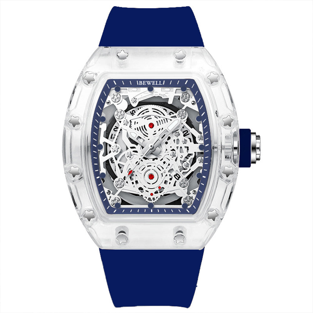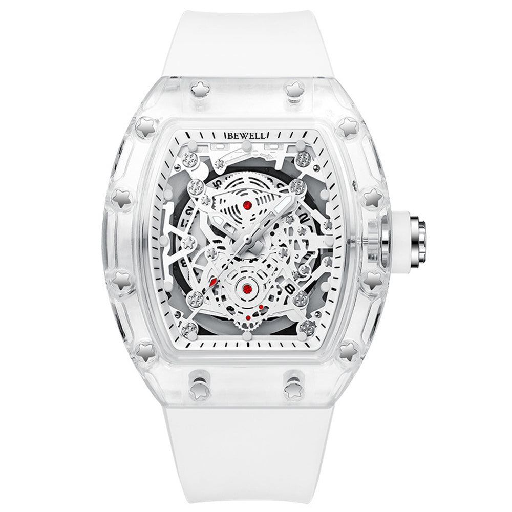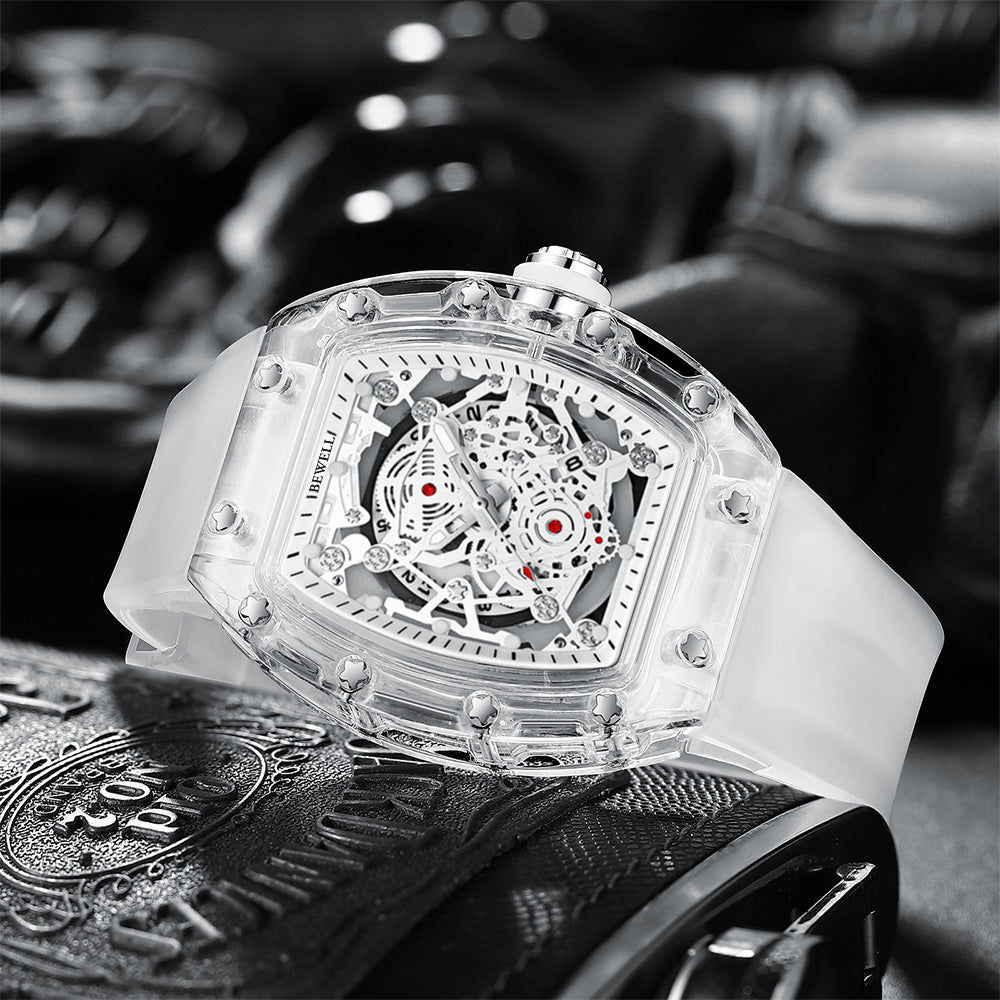 Barrel Case Mechanical Watch with Transparent Glass and Rubber Strap