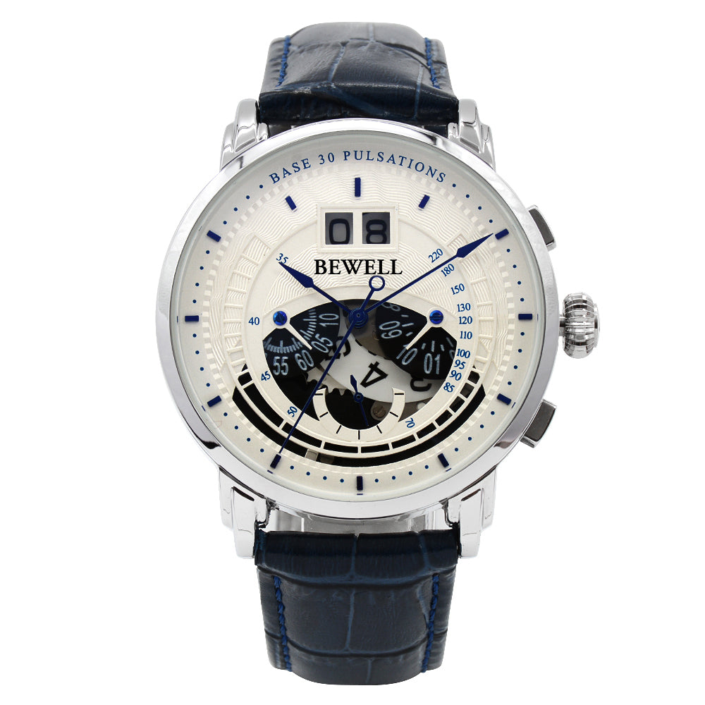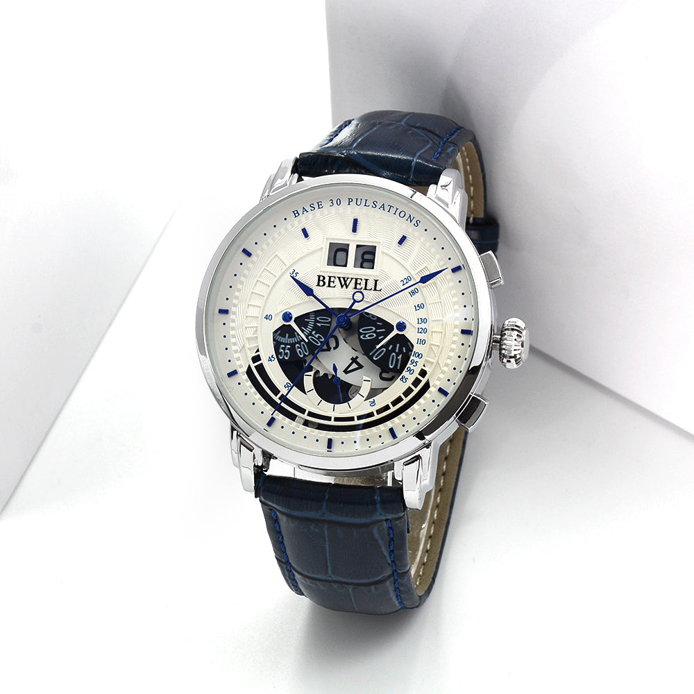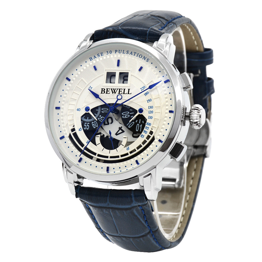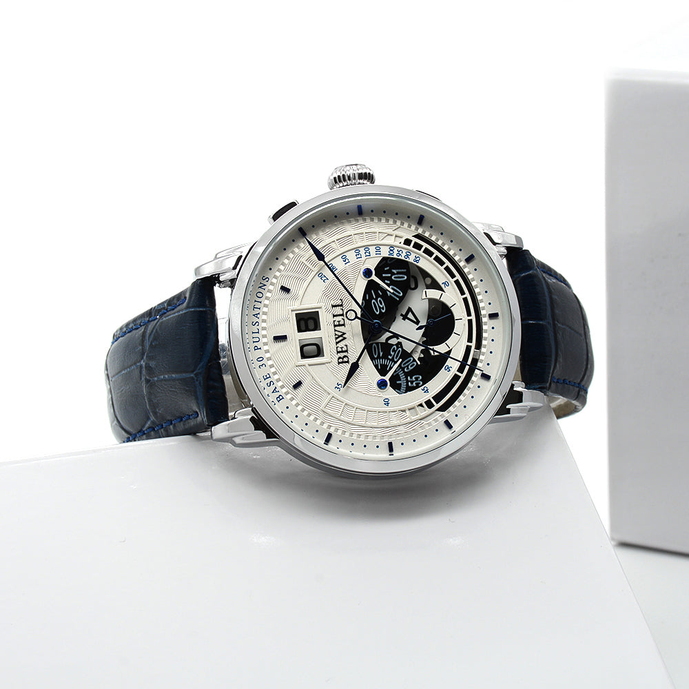 Minimalist Large Dial Multifunction Stainless Steel Watch with Leather Strap